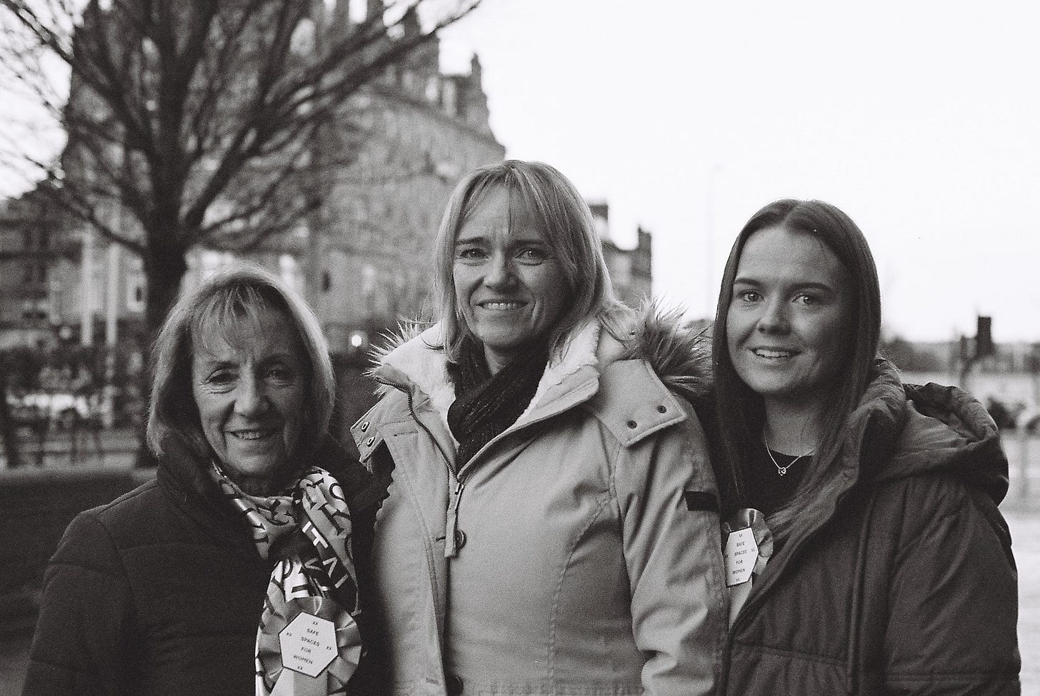 Sheila Bell (Sandie Peggie’s mother), Sandie Peggie and Nicole Peggie outside the tribunal in Dundee, February 2025. Image credit: Bryndís Blackadder