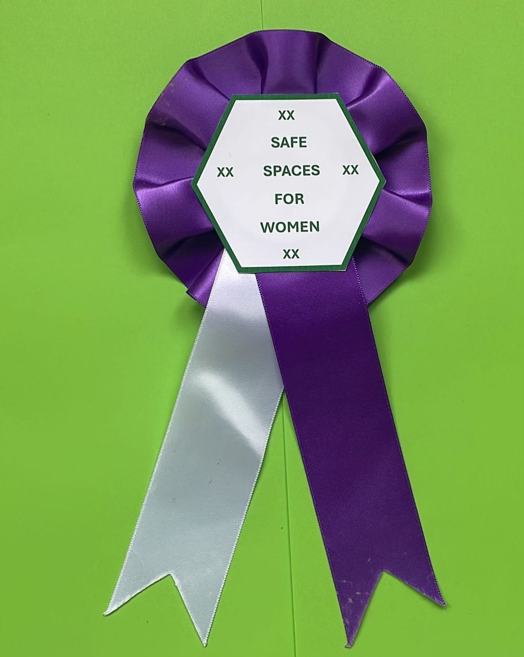 A rosette made by members of Sandie’s family and given to supporters who attended her tribunal case in February 2025