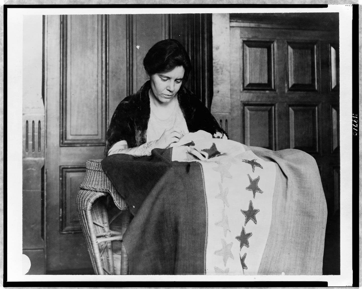Alice Paul stitching a Suffragette flag, 1912. Pic from the National Photo Company Collection via Wikimedia Commons