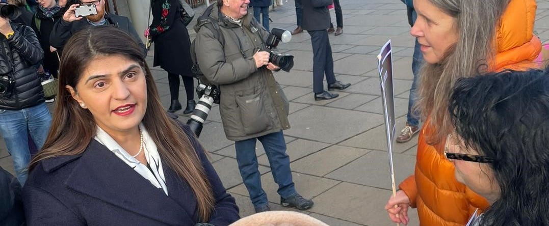 Pam Gosal MSP speaks to women outside the Scottish Parliament