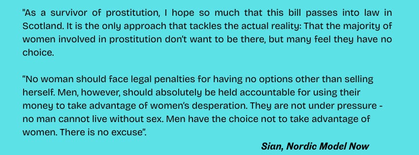 "If the SNP government's own words on their commitment to address the escalating crisis of male violence against women and girls mean anything, they must tackle it at its roots. Until Scotland follows Sweden and an increasing number of countries across the world by criminalising the purchase of sex, driving the normalisation of the objectification of women and desensitising the harm of the sex trade, we will never deliver true equality of the sexes. The message must be clear: women are not for sale - sex in Scotland is unbuyable."